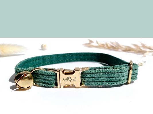 Gepersonaliseerde groene corduroy kattenhalsband